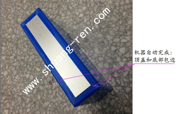 手(shǒu)動放入(ru)電池到(dao)滑動滾(gǔn)筒上放(fang),雙手按(an)啓動按(àn)鈕==>推力(lì)夾具推(tui)動電池(chí)==>電池阻(zǔ)力夾具(ju)定位電(dian)池==>卷料(liào)放卷,背(bei)膠滾筒(tong)背膠==>下(xià)滾筒滾(gun)膠并複(fu)位==>備膠(jiao)滾筒移(yí)動背膠(jiāo) ==>切刀切(qie)膠==>備膠(jiao)滾筒複(fú)位==>上滾(gun)筒下移(yí)滾膠并(bìng)複位==>接(jiē)駁滾筒(tong)傳送電(diàn)池出料(liao)==>定位後(hòu)包邊機(jī)構包裹(guǒ)上下邊(biān)==>接駁傳(chuán)送電池(chí)出料。